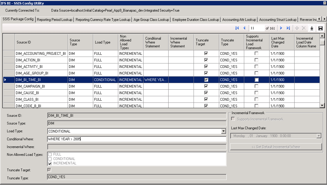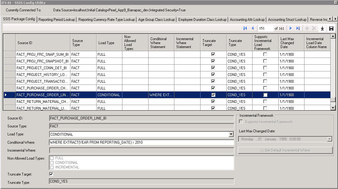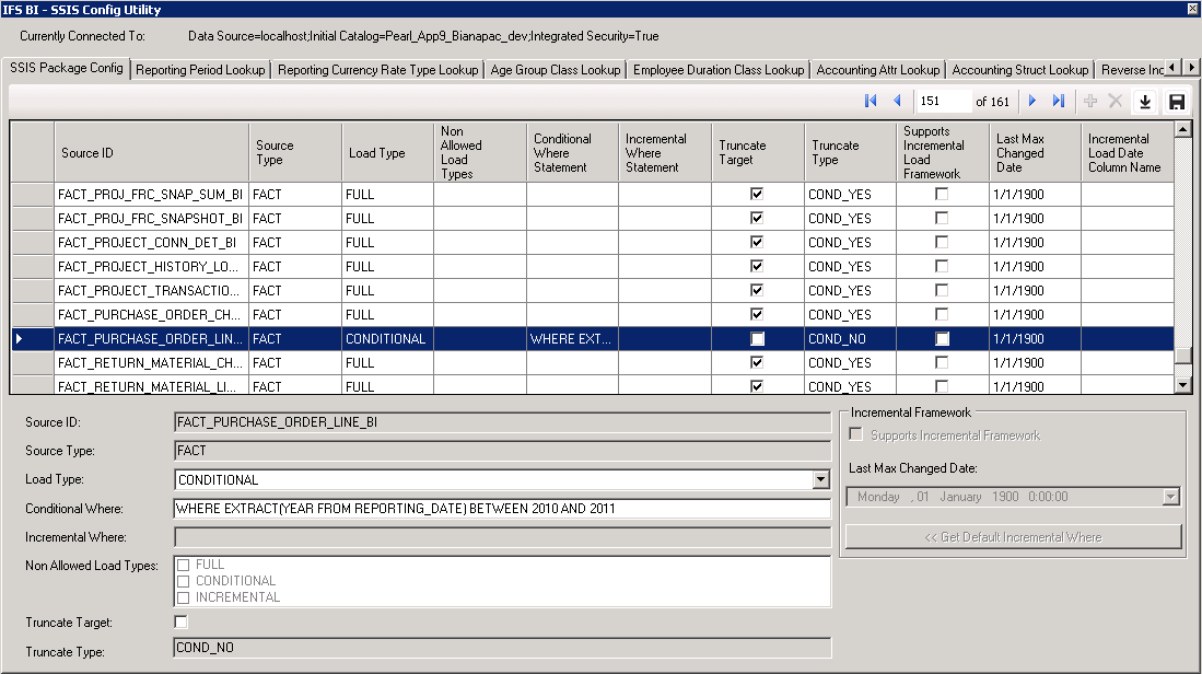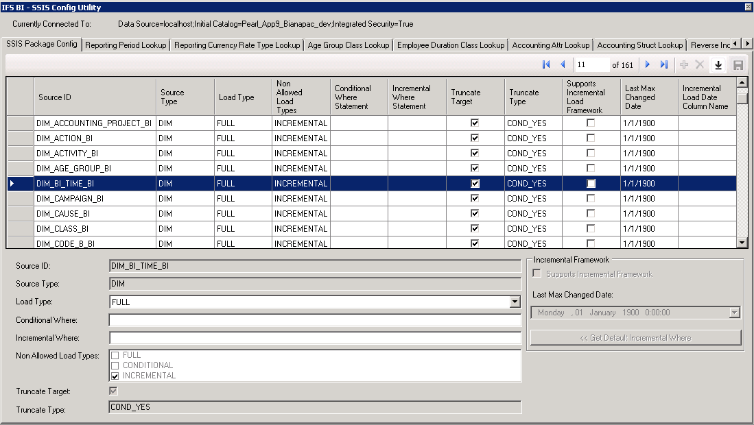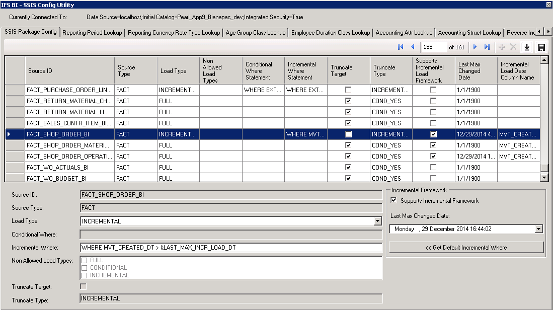 | Supports Incremental Framework | This check box will be automatically selected for entities/sources that support true incremental load, i.e. where the source in IFS Applications is a table supported by the incremental framework in BI Services. For all other entities/sources the check box will be unchecked and everything in the group box Incremental Framework will bi disabled. |