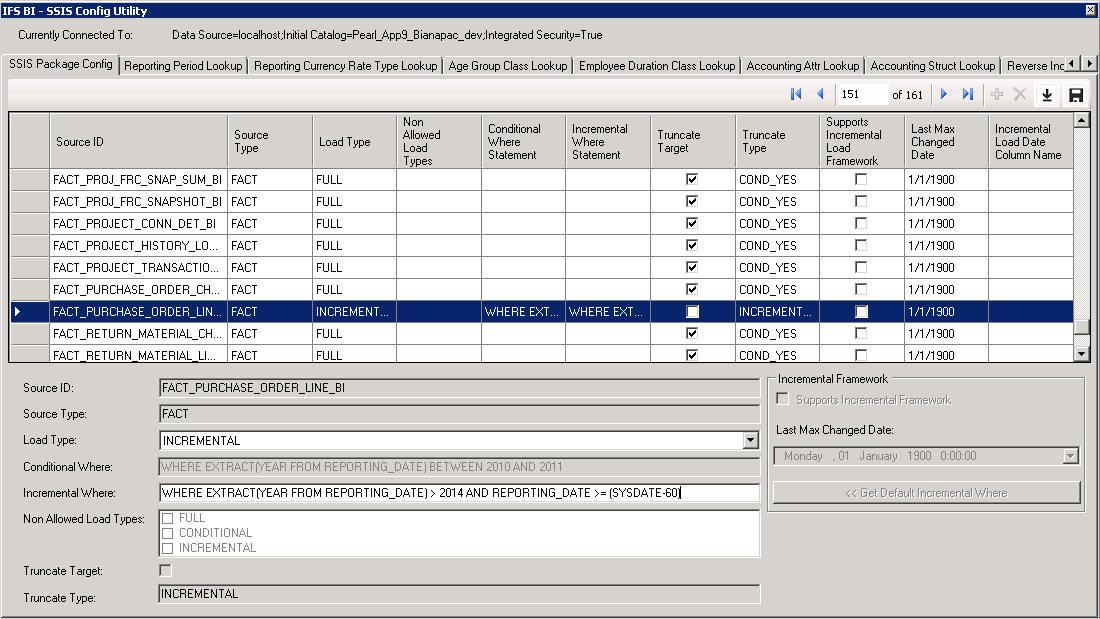 In the above case the fact source FACT_PURCHASE_ORDER_LINE_BI will be loaded incrementally with a WHERE condition based on the REPORTING_DATE column, where the year part should be greater or equal to 2014 and the reporting date is not older than 60 days.
