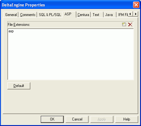 The Delta Engine uses a number of built in parsers to analyze source code. A number of properties tabs are used to tell Delta Engine which parser various file extensions shall use. You can add and remove extensions manually if the default setup isn’t fitting your environment.