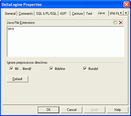 Use the Java tab to define file extensions to be handled by the Java parser.