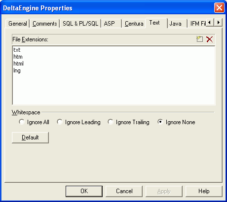 Use the Text tab to define file extensions to be handled by the Text parser. This parser is not programming language specific but can handle any file on the ASCII text format. This parser might be useful when it comes to analyzing differences between files but will not keep up with performance and hit rate (i.e. context problems) compared to the programming language parsers.